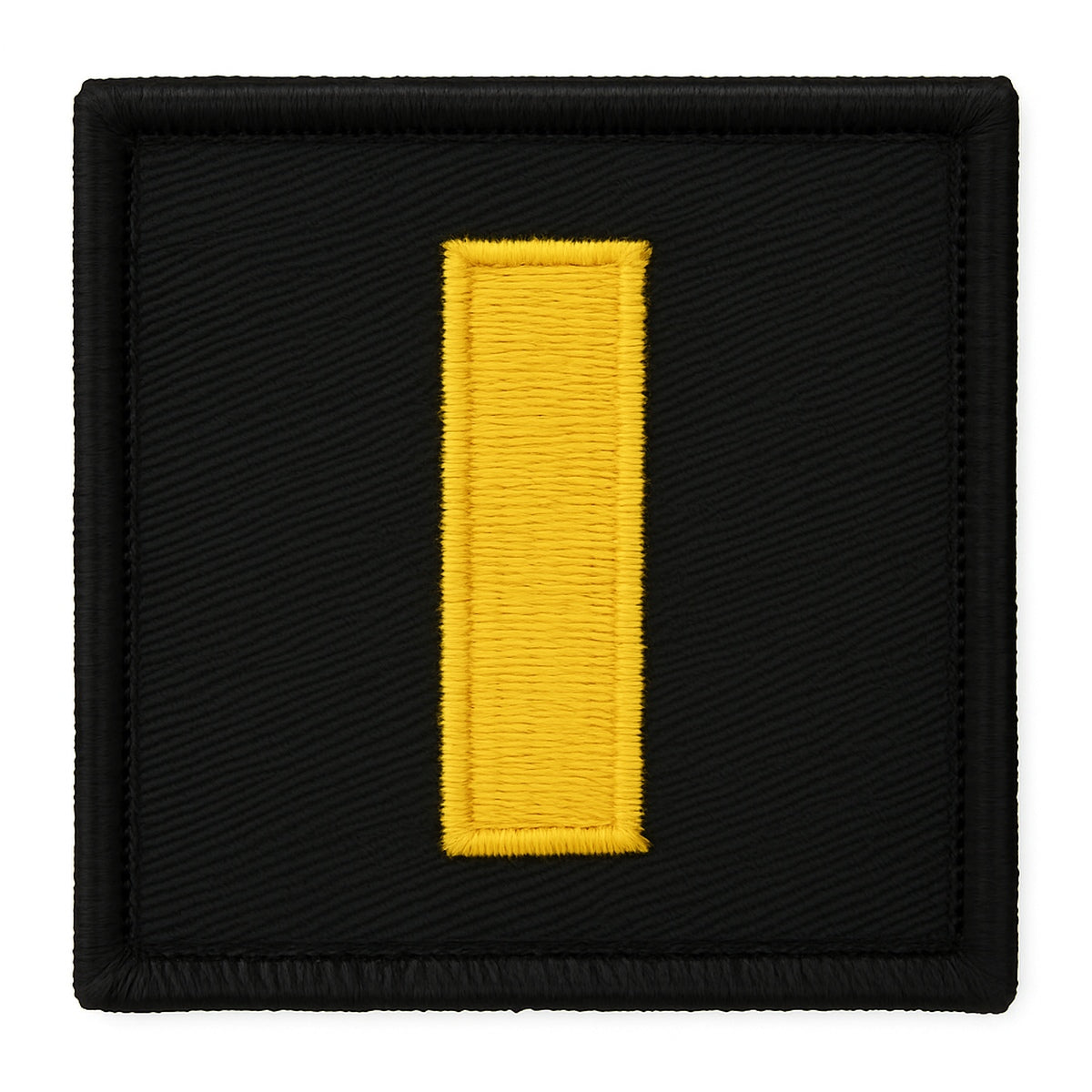 LT Embroidered Rank Medium Gold on Black, 1½" x 1½" (Pair) Professional lieutenant rank patches with a single vertical gold bar on a black field for clear, high-contrast identification. Dense, full embroidery keeps edges crisp and color true through daily wear and routine laundering. Sew-on backing delivers a clean, tailored install on duty uniforms.