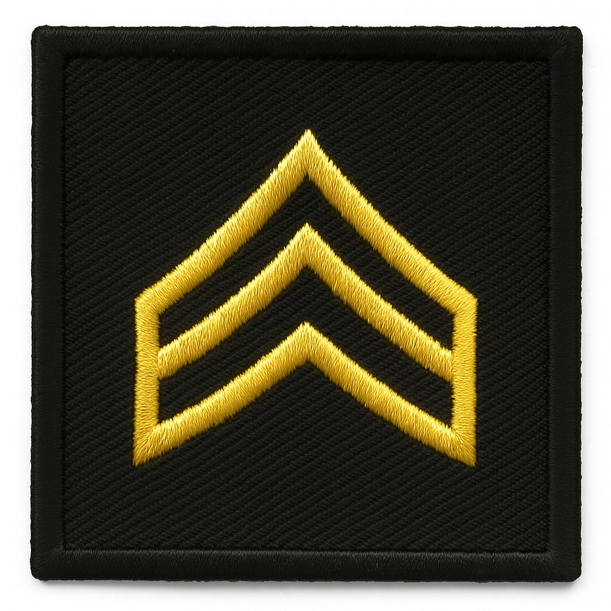 SGT Embroidered Rank Medium Gold on Black, 1½" x 1½" (Pair) Show sergeant rank with sharp, inspection-ready clarity. These square patches feature two medium-gold chevrons centered on a deep black field for immediate, high-contrast recognition on sleeves or chest. Fully embroidered with dense stitching for crisp edges and rich color, they're built for daily duty wearholding shape and sheen through routine washing. The sew-on backing installs cleanly for a low-profile, professional finish. Sold as a matched pair for left/right uniform symmetry.